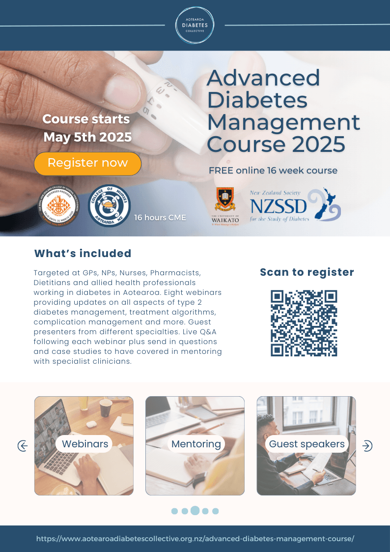 A sixteen week course that is designed for any healthcare professional working in Aotearoa New Zealand with a focus on advanced type 2 diabetes management in primary care.